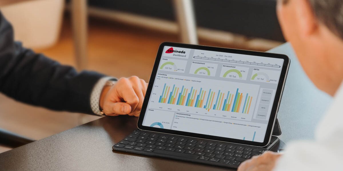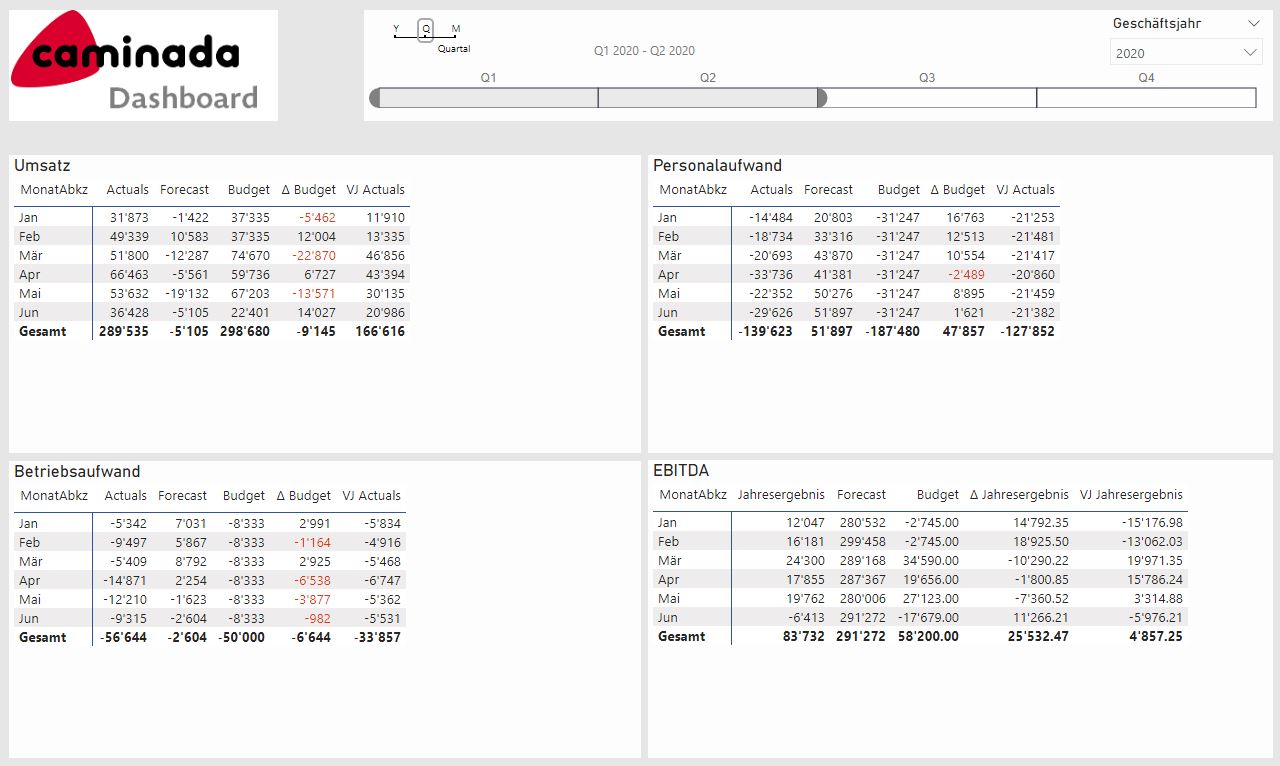 Die Rückmeldungen von Kunden und unsere eigenen Erfahrungen haben bestätigt, dass das Caminada Dashboard ein sehr wertvolles Führungsinstrument ist. Schnell und leicht verständlich verschaffen Sie sich in wenigen Minuten einen aufschlussreichen Überblick über die Finanzdaten und KPIs Ihrer Firma, sehen die aktuellen Entwicklungen und können daraus Handlungsalternativen ableiten.